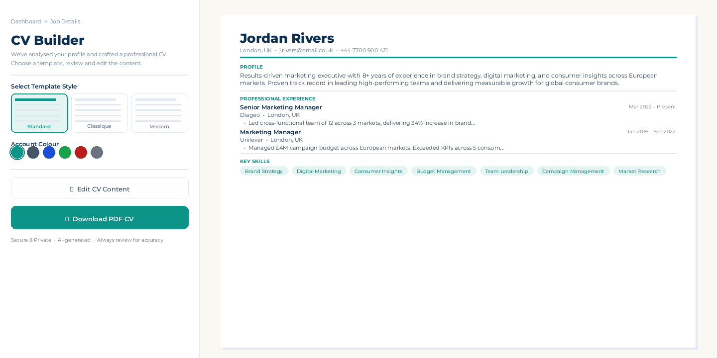 A short coaching chat fills in what a CV can't capture: your goals, the roles you're targeting, anything worth highlighting. Your career profile and ATS-ready CV are ready immediately after.